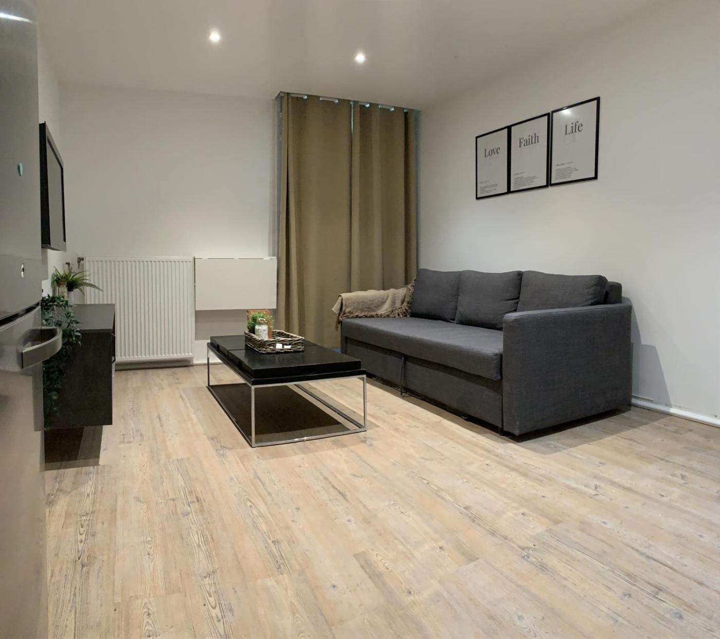 Cet appartement comporte 1 chambre, une cuisine, une télévision à écran plat, un coin salon, ainsi que 1 salle de bains avec une douche.