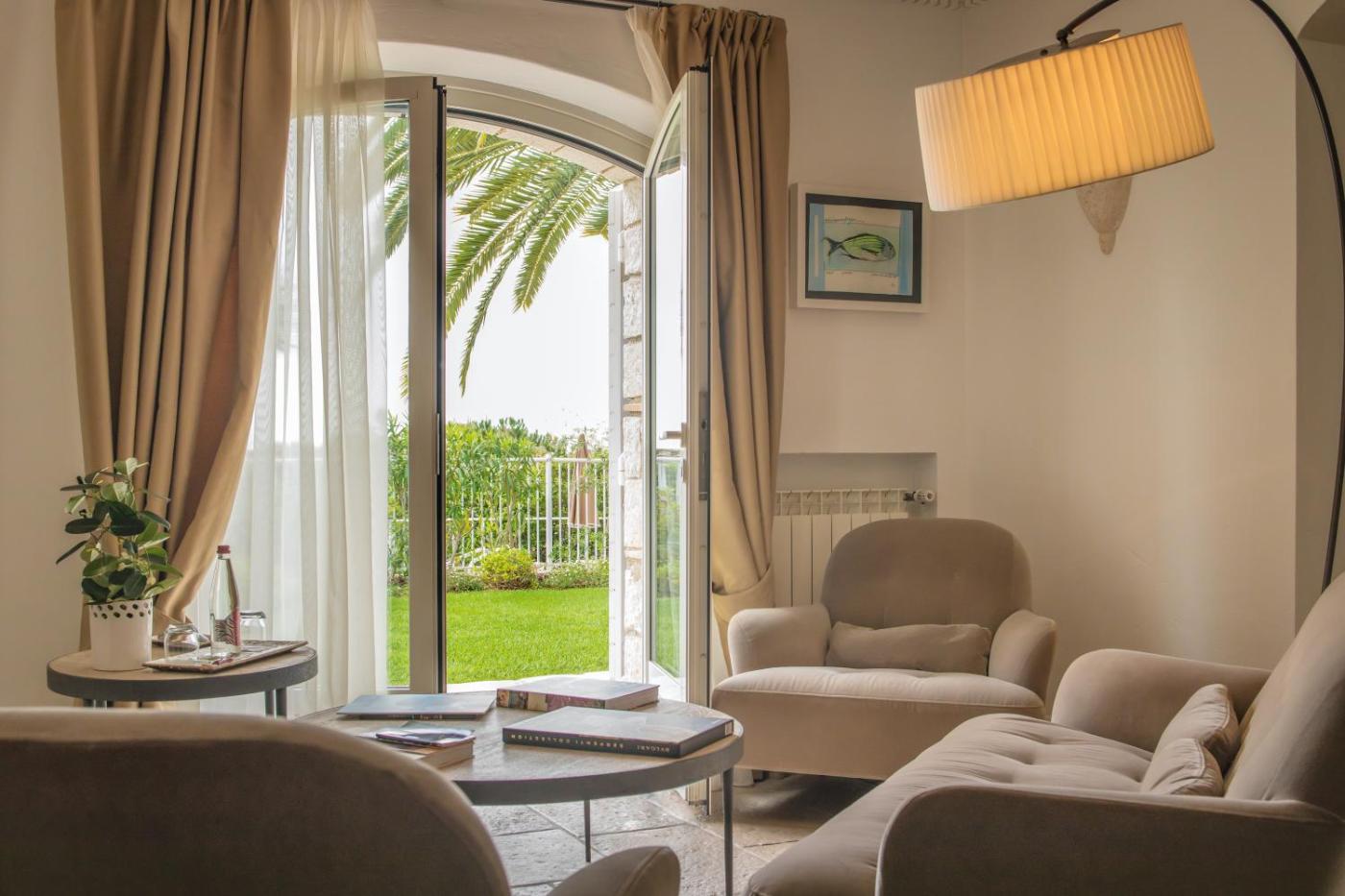 Junior Suite on Garden. Cette suite dispose d’un jardin privé, d’une télévision à écran plat ainsi que d’une salle de bains privative en marbre pourvue d’une douche à l’italienne, d’un peignoir et de chaussons. Un minibar et une machine à café sont également fournis. ;