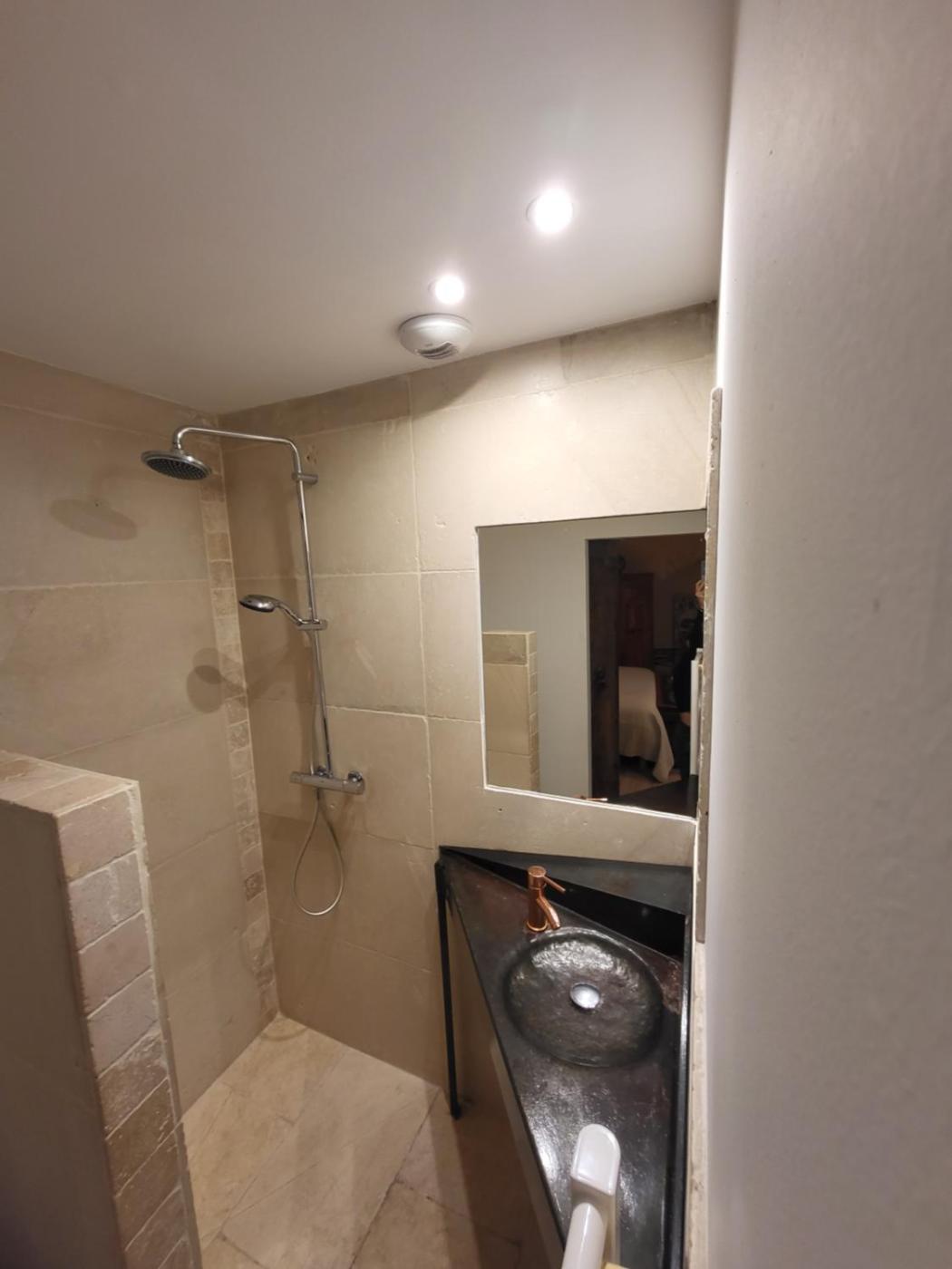 Chambre Double avec Salle de Bains Privative. This double room has its own private entrance, a fridge, a kettle, a microwave. It has marble floor, air conditioning and garden view.
