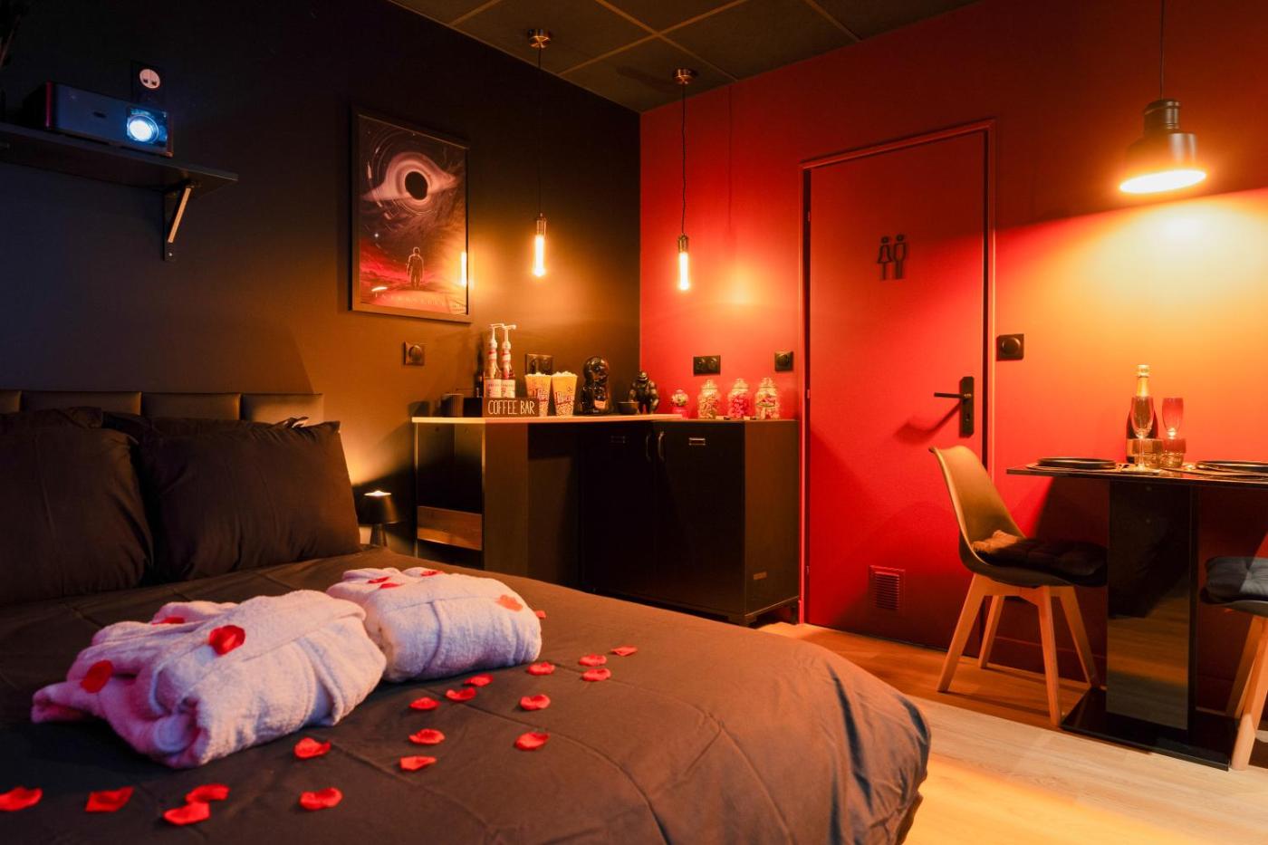 Appartement 1 Chambre. The hot tub and spa bath are the standout features of this apartment. Guests can make meals in the kitchen that has a stovetop, a refrigerator, kitchenware and a microwave. This apartment has a coffee machine, heating and a flat-screen TV with streaming services. The unit has 1 bed.