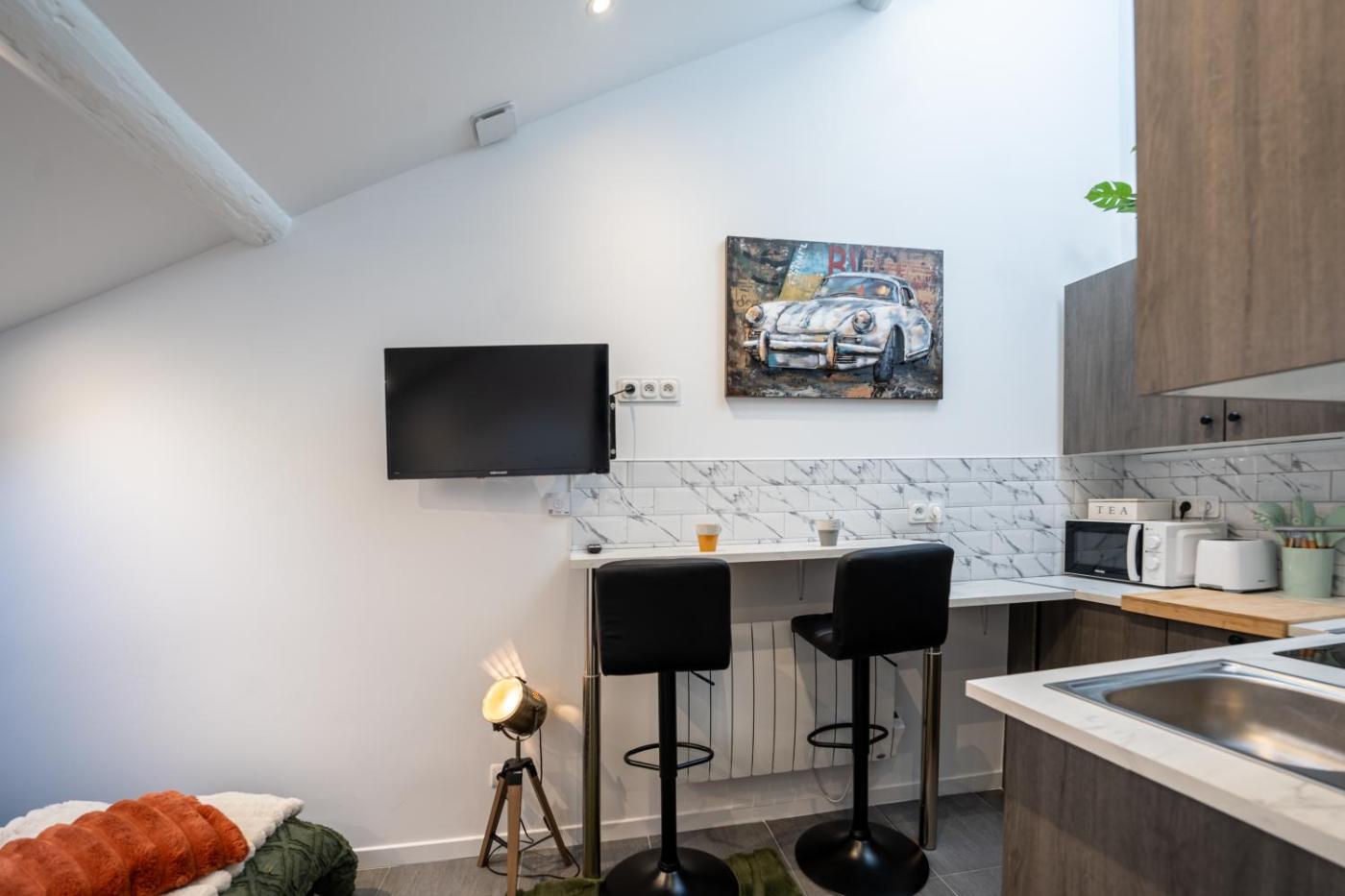 Appartement 1 Chambre. The well-equipped kitchen features a stovetop, a refrigerator, kitchenware and a microwave. The apartment provides a tea and coffee maker, a dining area, a tiled floor, a flat-screen TV with streaming services, as well as city views. The unit offers 1 bed.