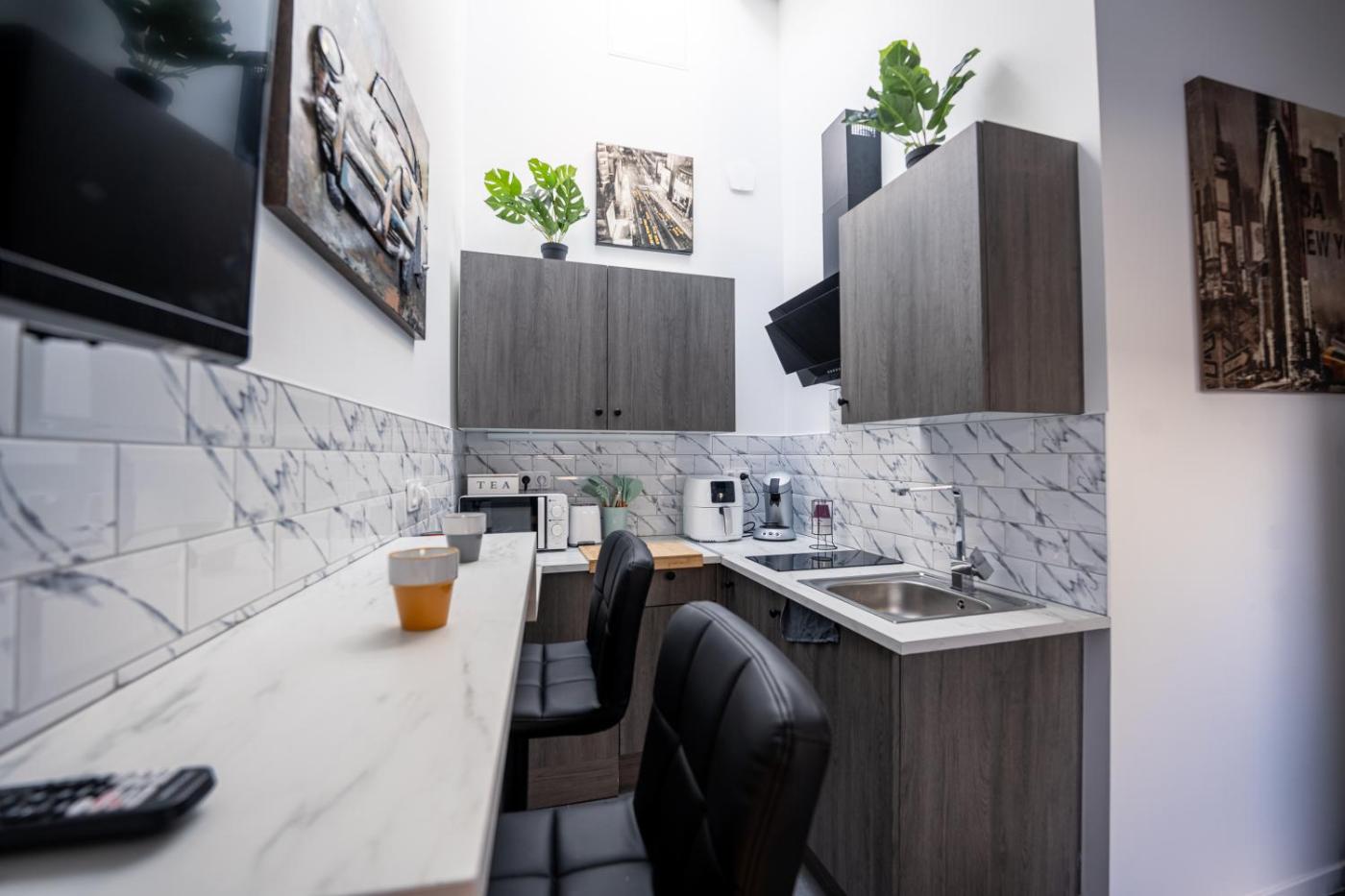 Cet appartement comprend 1 chambre, ainsi qu’une cuisine avec un réfrigérateur, un micro-ondes et une machine à café. Des serviettes et du linge de lit sont disponibles.